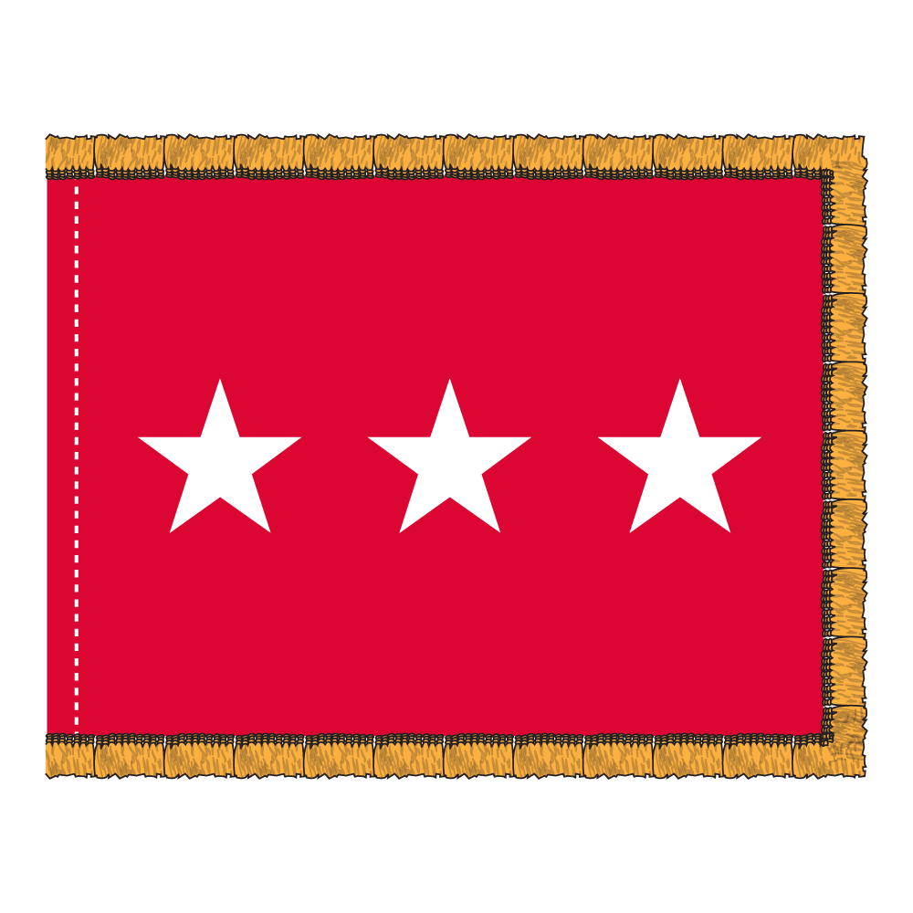 Display the Army 3 Star General Officer Flag Fringe to honor the rank of Lieutenant General in the United States Army, crafted for elegant ceremonial display. Made from UV-resistant 200 denier nylon, this flag features a deep red field with three white stars centered, resisting fading in various climates.
