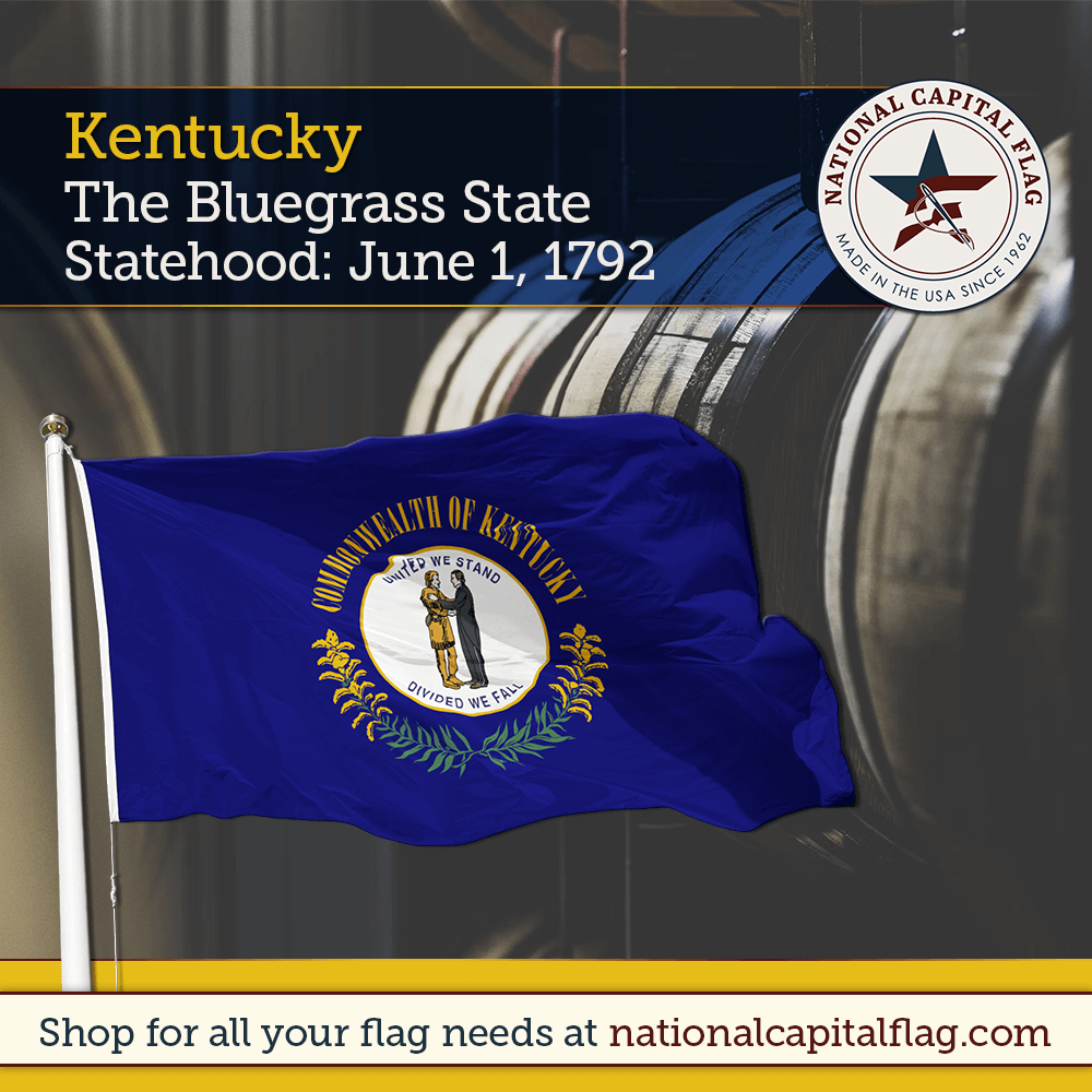 Kentucky’s flag features the state seal on a field of blue. The seal depicts a pioneer and a statesman shaking hands, symbolizing unity. Encircling the seal are the words “Commonwealth of Kentucky” and the state motto, “United We Stand, Divided We Fall.” The goldenrod, the state flower, adorns the bottom of the seal, representing the state’s natural beauty.