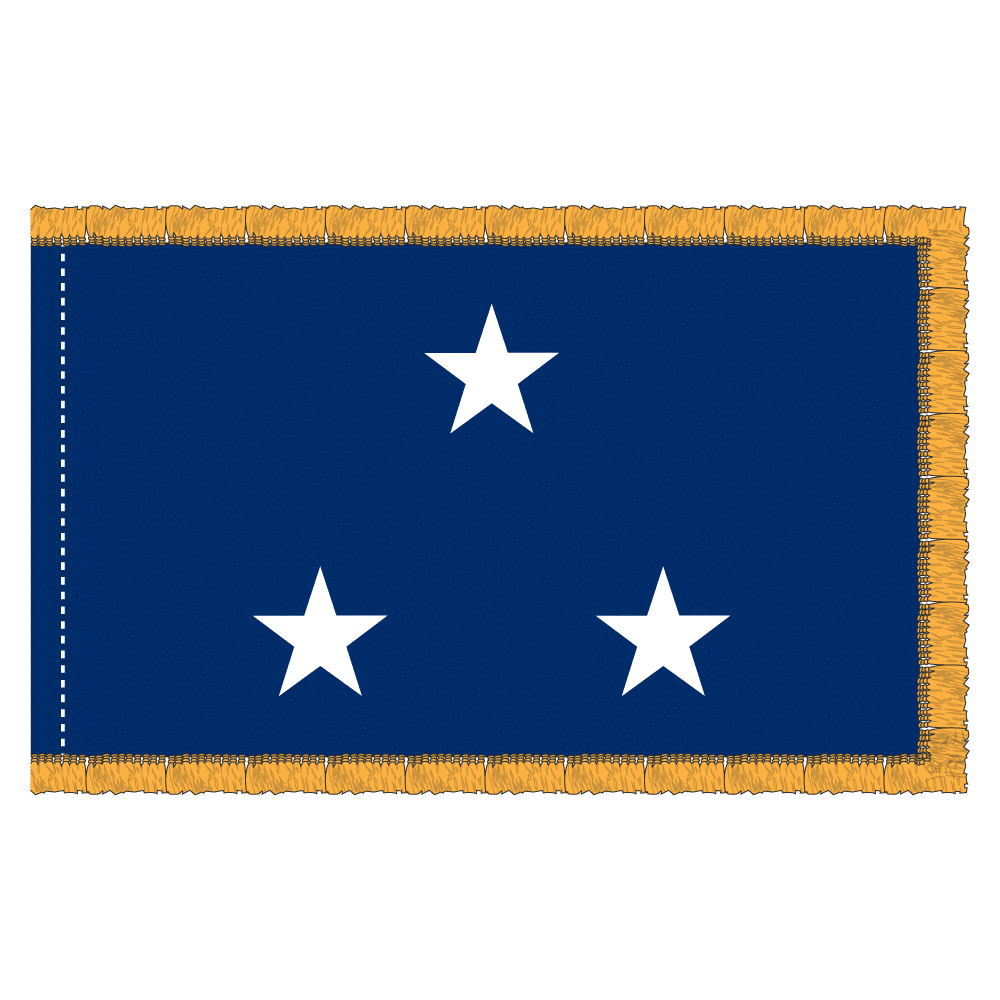 Display the Navy 3 Star Blue Admiral Flag Fringe to honor the rank of Vice Admiral in the United States Navy, crafted for elegant ceremonial display. Made from UV-resistant 200 denier nylon, this flag features a deep blue field with three white stars centered, resisting fading in various climates.