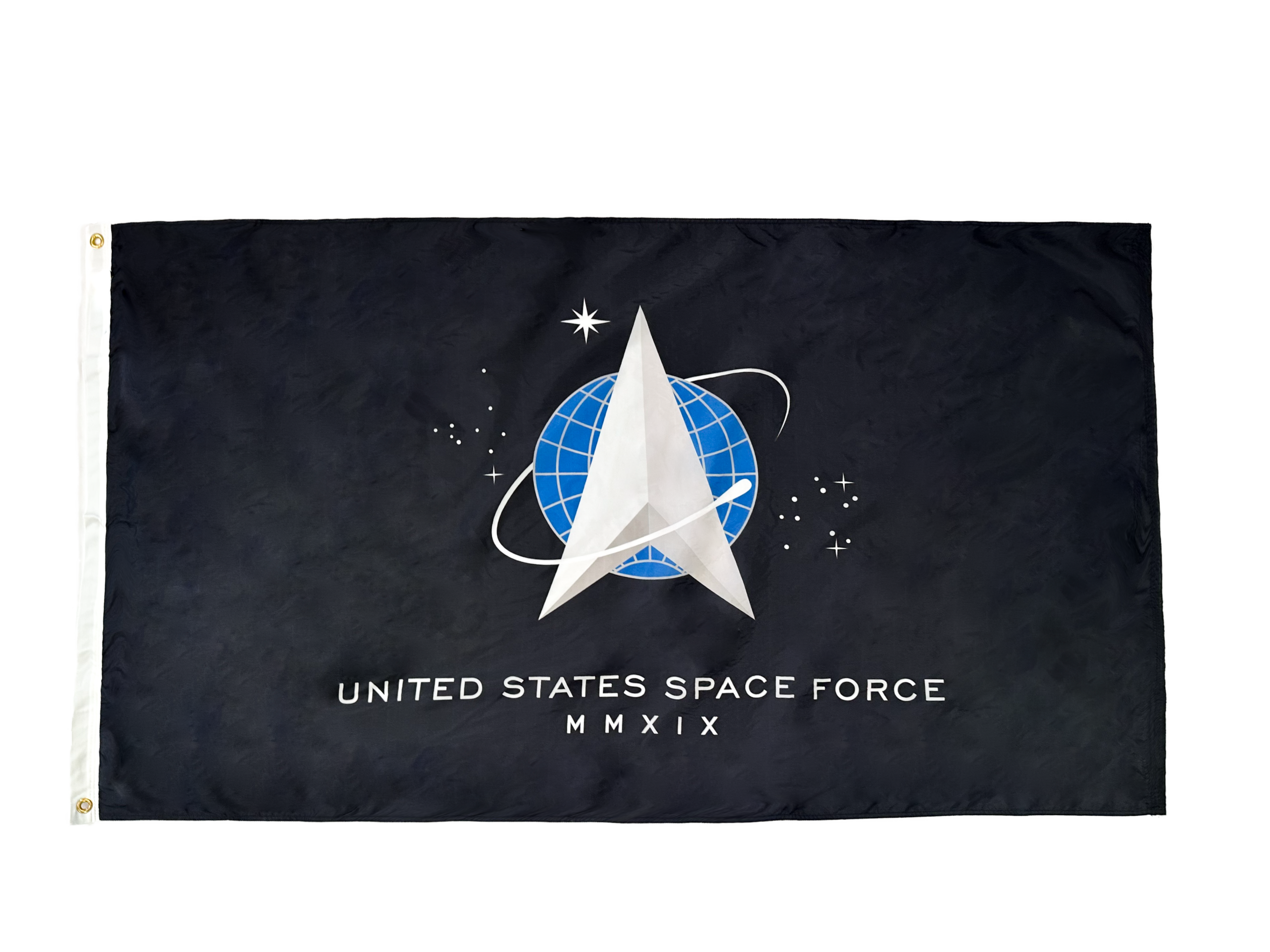 The US Space Force Flag was officially adopted on May 15, 2020, shortly after the establishment of the Space Force as the sixth branch of the U.S. Armed Forces on December 20, 2019. The design features a black field (representing the vastness of space) with the delta symbol and orbiting globe emblem, signifying protection of U.S. interests in space. The flag represents the newest military branch’s mission to organize, train, and equip forces to protect national interests in, from, and to space.